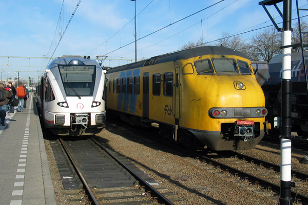 Nijmegen, 26 januari 2008. Het excursiematerieel wordt klaargezet op spoor 35, het beginpunt van de Maaslijn. De Maaslijn (Nijmegen-Venlo-Roermond) wordt ook wel de Heilige Lijn genoemd. De lijn is aangelegd in 1883 door de Nederlandse staat en is voor een groot deel enkelsporig. Vroeger was het een belangrijke schakel, met veel kolenvervoer uit de Limburgse mijnen en met doorgaande treinen tussen Amsterdam en Maastricht, via Hilversum, Amersfoort, Kesteren en Nijmegen. Plannen om de lijn te elektrificeren zijn nooit uitgevoerd. De lijn is beveiligd met ATB-NG. Tegenwoordig wordt de Maaslijn geëxploiteerd door Veolia, een maatschappij met een Franse achtergrond die in het verleden ook al in Nederland actief was als financier van Lovers Rail. Ook de busmaatschappij BBA is in handen van Veolia. Veolia heeft een tijd met Wadlopers gereden, die eigenlijk te traag zijn voor deze lijn. Sinds december 2007 rijden er moderne treinstellen: de Stadler GTW. |
