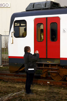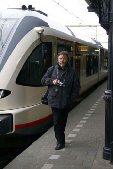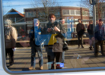 Roermond, 26 januari 2008. Ik fotografeer mijn spiegelbeeld in de ruit van een GTW. Zonder dat ik het merk word ik vanuit de trein gefotografeerd door Mark de Koning (je ziet hem rechts zitten, kijkend in het schermpje van zijn camera). |