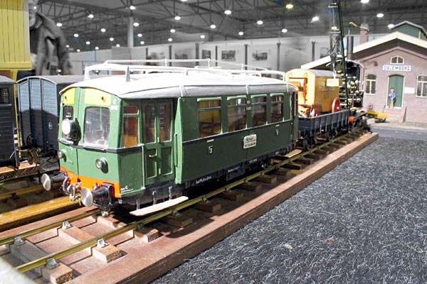 Leiden, 12 november 2004. Goederenloc 119 van de NBDS (de latere NS 4252) passeert motorrijtuig omBC 1904. Modellen van het Spoor 1 Genootschap. |