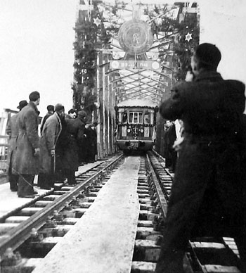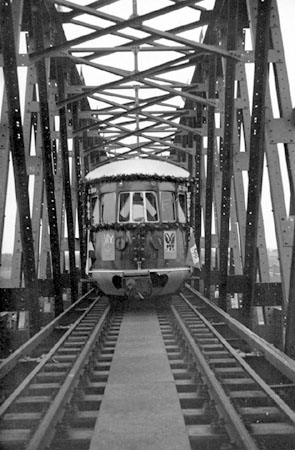 Westervoort, november 1946. Officiële ingebruikname van de herstelde brug over de IJssel. Zowel de trein als de brug zijn versierd met de gemeentewapens van Westervoort en Arnhem. De feesttrein is motorrijtuig omBC 2904. Foto's uit de collecties van Jaap van Amersfoort en Arjan de Jong. Klik hier voor meer over deze brug. |