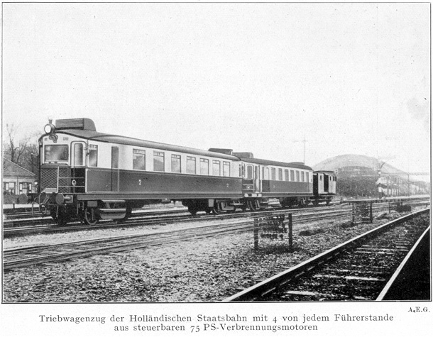 Twee motorrijtuigen uit de serie omBC 1901-1903, in Duitsland gebouwd in 1923. De benzinemotoren zijn later vervangen door dieselmotoren. De motorrijtuigen konden in stuurschakeling met elkaar rijden. Foto A.E.G. in het boek "Die Eisenbahn im Bild", Vierte Folge, 1925. |