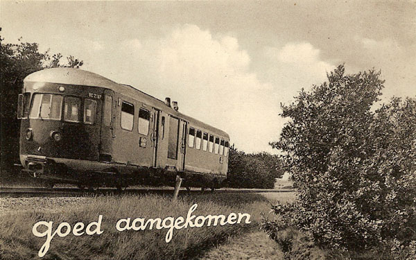 Oosterbeek Hoog. Motorrijtuig uit de serie omBC 2901-2908, op weg van Arnhem naar Amersfoort, via Ede en Barneveld. Deze route werd gereden tussen het najaar 1937 en de zomer van 1940. Ook waren er treinen die vanuit Doetinchem vertrokken. De motorrijtuigen waren gestationeerd in Arnhem. Prentbriefkaart. |