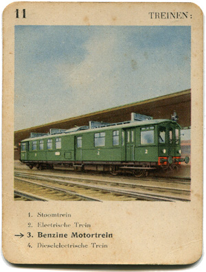 Een omBC uit de deelserie 1904-1910, gebouwd in de jaren twintig voor de Woldjerspoorweg (Groningen-Delfzijl via Slochteren). Deze serie is gebouwd door Werkspoor. De benzinemotoren zijn later vervangen door dieselmotoren. Uit een kwartetspel van de Nederlandsche Spoorwegen, uitgegeven rond 1935. |