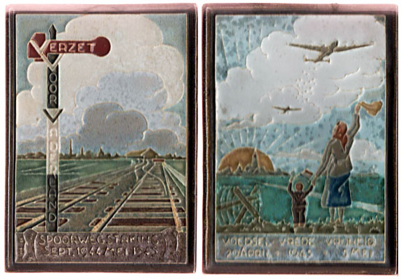 Twee tegeltjes van gips, circa 14 x 20 cm, vervaardigd bij TL (Porceleyne Fles) in Delft. Ze zijn afkomstig uit de nalatenschap van de grootvader van Ed van Kraanen en zijn broer. Die grootvader heeft onder andere als machinist dienstgedaan op "Bello". Het linker tegeltje heeft betrekking op de spoorwegstaking die in september 1944 is uitgeroepen, en die tot gevolg had dat een groot deel van Nederland nauwelijks meer bevoorraad kon worden - de beruchte hongerwinter. Het rechter tegeltje "Voedsel Vrede Veiligheid" verbeeldt de voedseldroppings bij de bevrijding in mei 1945; in de achtergrond de skyline van New York. In deze serie zijn nog twee tegeltjes verschenen: "Den Vaderlant Ghetrouwe (Nederlandse burgers verslaan een draak die de nazi's voorstelt) en "Nederland Zal Herrijzen" (uitbeelding van de bevrijding). |