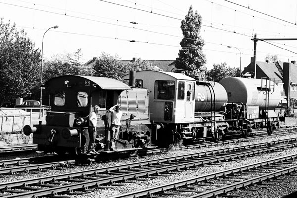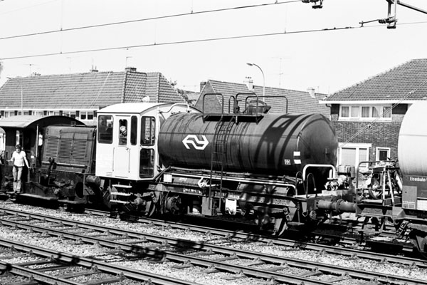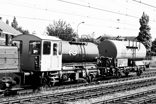 Zwolle, 28 april 1973. Loc 2530, inmiddels geel/grijs, met de sproeitrein. Deze loc had als enige van haar serie een cabine met grote ramen en een wat lagere huif rond de apparatuur, waardoor de machinist een veel beter zicht had op de baan. Deze loc werd daarom vaak ingezet het trekken van de sproeitrein. In zo'n geval werd op de omloop van de loc een huisje gezet voor de bediening van de sproei-installatie. |