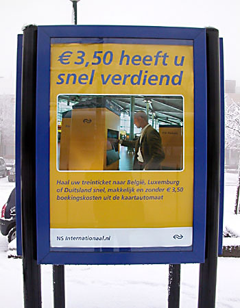 NS Internationaal doet ontzettend zijn best om het kopen van kaartjes aan het loket te ontmoedigen. Die loketten moeten natuurlijk dicht, zodat internationale kaartjes alleen nog kunnen worden gekocht door mensen die handig zijn met automaten of met internet. Dan gaan er weer minder mensen met de internationale trein, enzovoort. Buitenlandse treinreizen boeken? Probeer het eens bij de Treinreiswinkel: www.treinreiswinkel.nl |