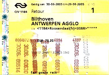 Ik moest op 30 juni 2005 naar Antwerpen. In die tijd was Antwerpen Centraal niet rechtstreeks bereikbaar vanwege een grote verbouwing. Volgens de NS-treinplanner zou ik eerst naar Roosendaal moeten reizen, om daar de stoptrein naar Antwerpen te nemen. De voor de hand liggende reis met de Beneluxtrein, met overstappen in Berchem, werd niet genoemd. Wel hebben de conducteurs die dag ontzettend hun best gedaan, zoals je aan de stempels kunt zien. ... of in Wildert?Op 26 oktober 2006 moest ik naar Wildert. Dat is een gehucht tussen Essen en Kalmthout. Een station is er niet,