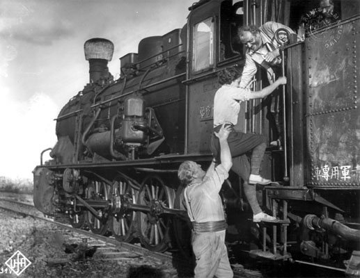 Stills uit een UFA-film, waarschijnlijk gemaakt voor de Tweede Wereldoorlog. Stoere Duitse mannen voeren een gevaarlijke operatie uit rond een Chinese trein. Dat wil zeggen, het is een volbloed Pruisische locomotief (G10, Baureihe 57.1) waar wat Chinese tekens op zijn geschilderd. Een eenvoudige vonkenvanger op de schoorsteen zorgt voor de finishing touch. De foto's zijn goedgekeurd door de Nederlandse Rijksfilmkeuring. Foto's collectie Nico Spilt. |