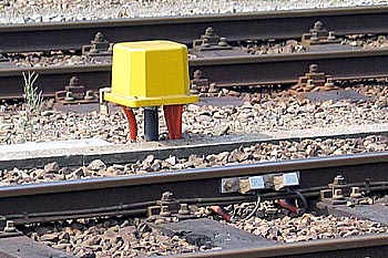 AssentellerHeerlen, 10 juli 2005. Assenteller. Van een passerende trein wordt het aantal assen geteld. Bij de volgende assenteller gebeurt dit opnieuw. Hierdoor kan worden vastgesteld of de volledige trein is gepasseerd. De standaardbeveiliging is gebaseerd op contact tussen rails en wielen. Een passerende trein zorgt voor kortsluiting tussen de spoorstaven, die vervolgens de beveiliging in werking zet. Met de komst van de nieuwe generatie dieseltreinstellen, die relatief licht zijn, is een goed geleidend contact tussen de wielen en de rails niet langer gegarandeerd. Het assentellersysteem is ook bij lichtere treinstellen betrouwbaar. Het reageert op een veranderend magnetisch veld als gevolg van een passerend treinwiel. Door twee assentellers na elkaar te plaatsen kan de rijrichting worden bepaald. |