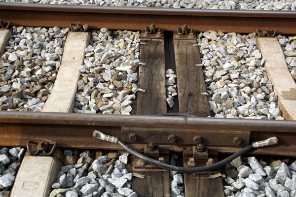 Hilversum, 30 september 2014. Spoorstaven werden vroeger door middel van lasplaten met elkaar verbonden. Tegenwoordig worden de staven zoveel mogelijk aan elkaar gelast. Op plaatsen waar de spoorstaven elektrisch van elkaar gescheiden moeten blijven, worden zogeheten ES-lassen gebruikt (ES: elektrische scheiding). Op deze foto is een vroegere ES-las te zien. Omdat de beveiliging is veranderd, hoefde deze las niet meer isolerend te zijn. Om er zeker van de zijn dat de spoorstroom ongehinderd kan passeren, heeft men de spoorstaven met twee kabels met elkaar verbonden. Foto Rienk Nauta. |