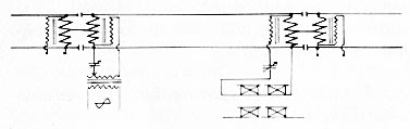 Ook naar de grote ijzeren kast zie je kabels lopen. In die kast zit een railtransformator (ook railspoel genoemd). Deze bestaat uit een spoel van zware koperstrip, waar de tractiestroom doorheen kan maar die de beveiligingswisselstroom tegenhoudt. Spoelen hebben namelijk de eigenschap dat ze wisselstroom tegenhouden terwijl gelijkstroom er makkelijk doorheen gaat. Hiermee wordt het probleem opgelost dat spoorrails twee functies hebben: ze dienen als retourleiding voor de door elektrische treinen gebruikte stroom, en ze hebben een functie bij de beveiliging. Spoorstaven zijn op veel plaatsen onderbroken door isolerende lassen, zoals op deze foto. Wanneer een trein over een geïsoleerde spoorstaaf rijdt, wordt via de assen van de trein een verbinding gemaakt met de andere spoorstaaf. Er gaat dan een stroom lopen waardoor bijvoorbeeld een overweg wordt gesloten of een sein op rood springt. Vaak zie je twee railtransformatoren vlak naast elkaar. Dit is het geval als beide spoorstaven onderbroken zijn, bij de zogeheten "dubbelbenige isolatie". De spoelen waar de tractieretourstroom doorheen loopt zijn in dit schema dik getekend. In het midden zijn ze met elkaar verbonden. De railtransformatoren beschikken over een tweede wikkeling van dun draad, die gebruikt wordt om de beveiligingswisselstroom op de spoorstaven over te brengen (links in de tekening) danwel om deze stroom van het spoor te halen en naar de beveiligingsrelais te voeren (rechts in de tekening). Bron: Op de Rails 1980/SW. Op baanvakken zonder bovenleiding zijn railtransformatoren in principe niet nodig, omdat hier geen tractiestroom is die terug moet naar het onderstation. Echter, bij Duitse en Belgische diesellocomotieven met elektrische treinverwarming worden de spoorstaven ook gebruikt voor de retourstroom van de verwarming. Op bepaalde Nederlandse baanvakken mocht de elektrische verwarming dan ook niet worden gebruikt als er een loc van de DB of de NMBS voor stond. Bij de trek-trektreinen met twee 2200'en, waarin speciale verwarmingswagens meereden, werd de retourstroom van de verwarming via een aparte kabel door de trein geleid en speelde dit probleem dus niet. Geïsoleerde lassen kunnen van belang zijn bij het tegengaan van zwerfstromen. |