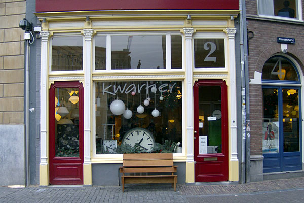 Utrecht, 16 december 2009. Bij de firma Kwartier in Utrecht kopen wij altijd onze designspulletjes. In de etalage zag ik deze enorme dubbelzijdige klok van het merk Bürk, de Rolls Royce onder de stationsklokken. Helemaal gereviseerd, met nieuwe pulsgever, voor slechts 3250 euro. We denken er nog even over na. Bij Kwartier zijn ook kleinere oude klokken te koop, allemaal verschillend, allemaal werkend. |
