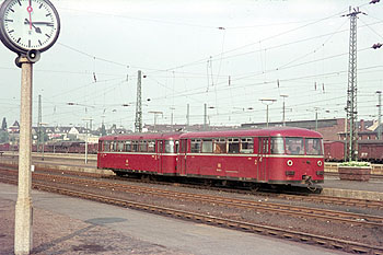 Düren, 11 augustus 1970. Het is bijna kwart over vier. De secondenwijzer staat heel even stil, om te wachten tot de minutenwijzer van de centrale moederklok het signaal krijgt om een stapje verder te springen. Daarna gaat ook de secondenwijzer weer verder. De Schienenbus bestaat uit motorwagen 795 384 en bijwagen 995 563. Tweede foto: Amsterdam Waterlooplein, 25 februari 2004. Een (stilstaande) klok van het GEB. |