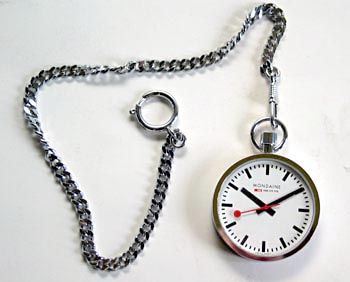 Klokje dat reminisceert aan het soort vestzakhorloge dat machinisten en andere spoorwegbeambten vroeger gebruikten. In 2004 gekocht op het Waterlooplein. Kitsch, quartz-uurwerk. Ik kreeg dit op 28 april 2004 voor mijn verjaardag. |