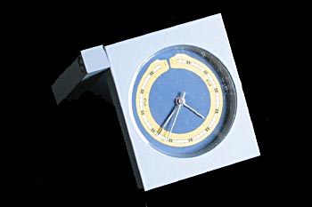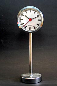 In 1996 ben ik gestopt met roken (ik rookte 10 wilde havanna's per dag). Het geld dat ik hier hiermee uitspaarde hield ik apart, totdat ik genoeg had om dit vestzakhorloge te kopen. Merk Mondaine, batterijuurwerk, model Zwitserse stationsklok. Van dit klokje bestaan diverse andere uitvoeringen, waaronder ook een staand model. Het klokje op de tweede foto is daarvan een imitatie, die ik in 2001 van mijn dochter Karin cadeau kreeg voor mijn verjaardag. |