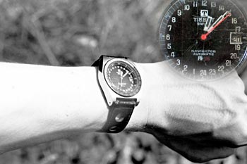 Mijn klokjes en horlogesSummerau, 23 augustus 1973 (inzet 2004). Een goed horloge is onmisbaar voor de serieuze treinspotter. Ik zit langs de spoorlijn naar Linz. Het is 8 over 1, of preciezer gezegd 13:08 uur. Om mijn pols zit een 24-uurshorloge, dat ik een jaar eerder voor mijn 21e verjaardag kreeg. De kleine wijzer loopt half zo snel als bij normale horloges. Om de wijzerplaat zit verder een verstelbare ring, waarmee je de tijd kunt aangeven als je je in een andere tijdzone bevindt. Dit soort horloges zou door piloten worden gebruikt. Merk Tissot (Zwitserland), type Navigator Automatic PR-516, mechanisch uurwerk, automatisch opwindmechanisme. |