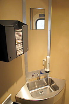 Het toilet van gerenoveerd treinstel 523 (7 januari 2005). Op de rechterfoto de wastafel van treinstel 273 (28 augustus 2004). De kraan hiervan werkt op de hieronder beschreven manier. |