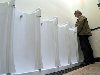 Spoorwegmuseum, 29 mei 2005. Dankzij een speciale ontheffing kreeg ik toegang tot een plek waar ik me niet zo vaak laat zien: het damestoilet. Het was mij begonnen om het gemak dat vroeger behoorde tot de koninklijke wachtkamer van Den Haag SS. Ik moet zeggen dat ik de pot er nogal gewoontjes vind uitzien. De attributen van het schoonmaakbedrijf lijken mij ook niet tot de originele entourage te behoren. Bij wijze van contrast ook nog een foto gemaakt van de (niet-koninklijke) urinoirs. Direct na het maken van deze foto stapte een mevrouw binnen die een nieuwe handdoekrol kwam plaatsen. Zij keek mij zeer vreemd aan... Maar ja, dit onderwerp interesseert mij nu eenmaal, dus dat moet ik er maar voor overhebben. Ooit zou er trouwens een ICR-A-rijtuig worden voorzien van Delftsblauwe betegeling in het toilet, in verband met de introductie van een tijdschrift over wc's (bron: HOV). Mail me als jij iets van dit rijtuig en/of tijdschrift afweet! |