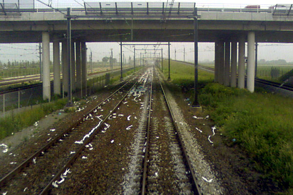Lage Zwaluwe, 7 juni 2007. Het is wit en het ligt van Breda tot Kijfhoek langs het spoor? De lading van Railion... Op Tilburg Goederen waren ze vergeten de deur van een schuifwandwagen te sluiten. De lading toiletpapier is er onderweg uitgedonderd en zorgde voor een enorme troep langs het spoor. Foto gemaakt met de mobiele camera van Veolia-machinist in opleiding Michiel de Wijs. |