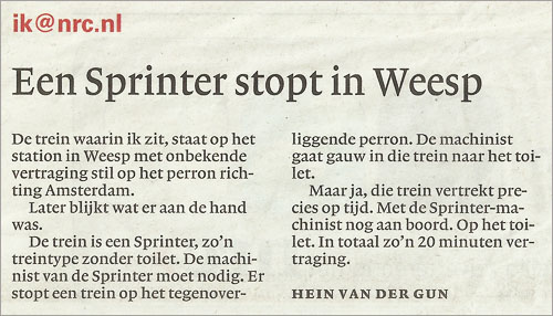NRC Handelsblad, 7 maart 2011. "Een Sprinter stopt in Weesp" door Hein van der Gun. |