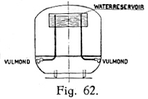 Algemeen bekend is. dat een modern spoorwegvoertuig voorzien is van toiletten met waterspoeling, welke automatisch werkt. Bij sommige oudere rijtuigen is de spoelinrichting gekoppeld aan de deur, zodat bij het verlaten van de inrichting gespoeld wordt. Bij het materieel van de laatste jaren is een spoelinrichting aangebracht, welke in werking treedt bij het loslaten van de bril. Voor de watervoorziening is in elk rijtuig een reservoir aanwezig. In sommige rijtuigen zijn meerdere reservoirs aangebracht. Het vullen geschiedt via een vulmond aan de stelbalk, zie fig. 62. De afmetingen dezer vulmonden, waarvan aan elke zijde van een rijtuig één is aangebracht, zijn internationaal vastgesteld, zodat het vullen overal kan plaatsvinden. Men kan aan het overlopen door de niet-gebruikten vulmond constateren dat het reservoir vol is.