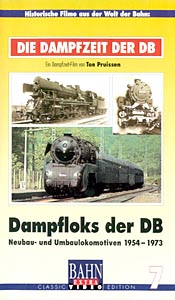 Preußische Dampflokomotiven. Film uit de serie Dampfzeit in Deutschland. Bahn Extra Video, 1995. Samengesteld door Ton Pruissen. 51 minuten zwart-wit- en kleuropnamen, met tekstboekje. Ook nadat er grote aantallen Einheitslokomotiven waren gebouwd, konden nog niet alle Länderbahnlokomotiven worden gemist. Pruisische locs zoals de series 38, 55, 78, 94 en 95 hebben het tot het eind van de stoomtijd uitgehouden. Dampfloks der DB. Film uit de serie Die Dampfzeit der DB. Bahn Extra Video, 1995. Samengesteld door Ton Pruissen. 51 minuten zwart-wit- en kleuropnamen, met tekstboekje. Op de hoes loc 10 001, een van de twee laatstgebouwde sneltreinlocomotieven van de DB. De film biedt een overzicht van de stoomlocs die tussen 1954 en 1973 zijn gebouwd of herbouwd bij de DB. |