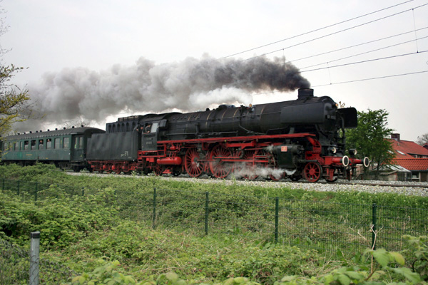 Bunnik, 16 april 2011. SSN-loc 01 1075 op weg naar Bochum-Dahlhausen. De bemanning groet de blokwachter.