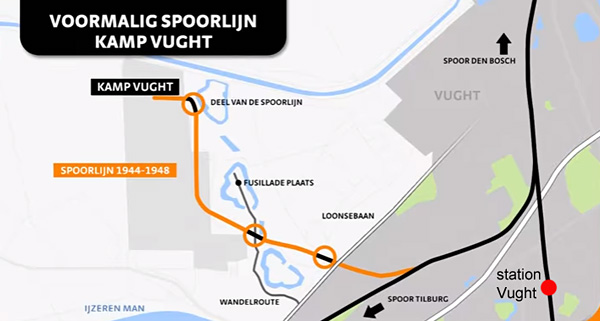 Kaartje met de voormalige spoorlijn naar Kamp Vught. Bron www.nmkampvught.nl (bewerkt). |